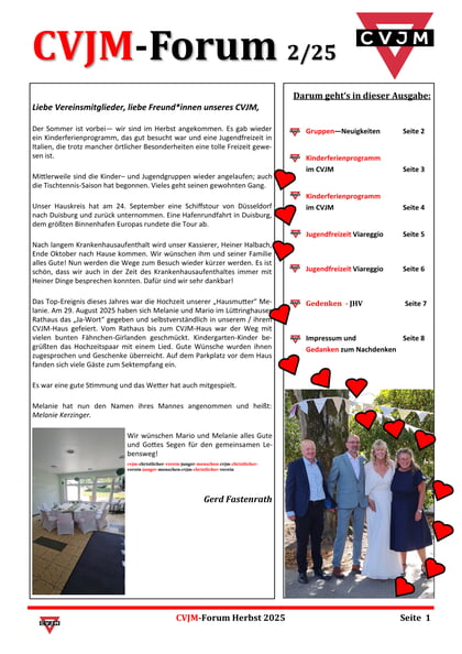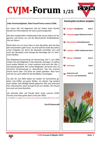 Du möchstest wissen, was in diesem Jahr alles bei uns im CVJM passiert ist? Dann bist du hier genau richtig. Hier findest du die aktuellen Ausgaben unseres CVJM-Forums des aktuellen Jahres. Blätter dich einfach mal durch !